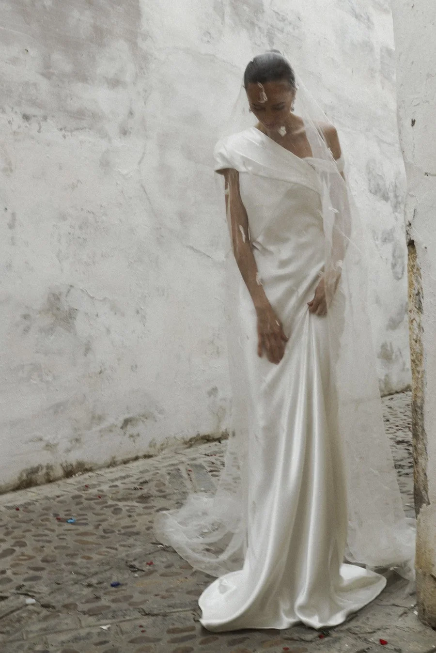 Velo de organza de seda en telar manual con bordado de pétalos de organza.